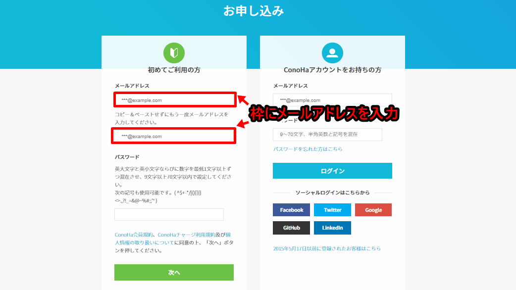 申込ページにアクセスすると下の画像のようにメールアドレス等の登録画面が出てきます。ここに自分のメールアドレスを入力します。